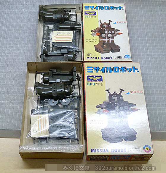 緑商会の「ミサイルロボット(1965年発売・当時100円)」です。 初版はイラスト箱ですが、その後出荷の写真箱に、箱サイズ違いがあります。画像の小箱にはST表示がありますが、無いバージョンもあるようなので、モーターロゴ違いを知らなければ、側面も大小同じデザインなので写真からは大きさ違いに気が付けません。 同様にシリーズの「ブラックサタン」「スチールジャイアント」にも小箱があります。